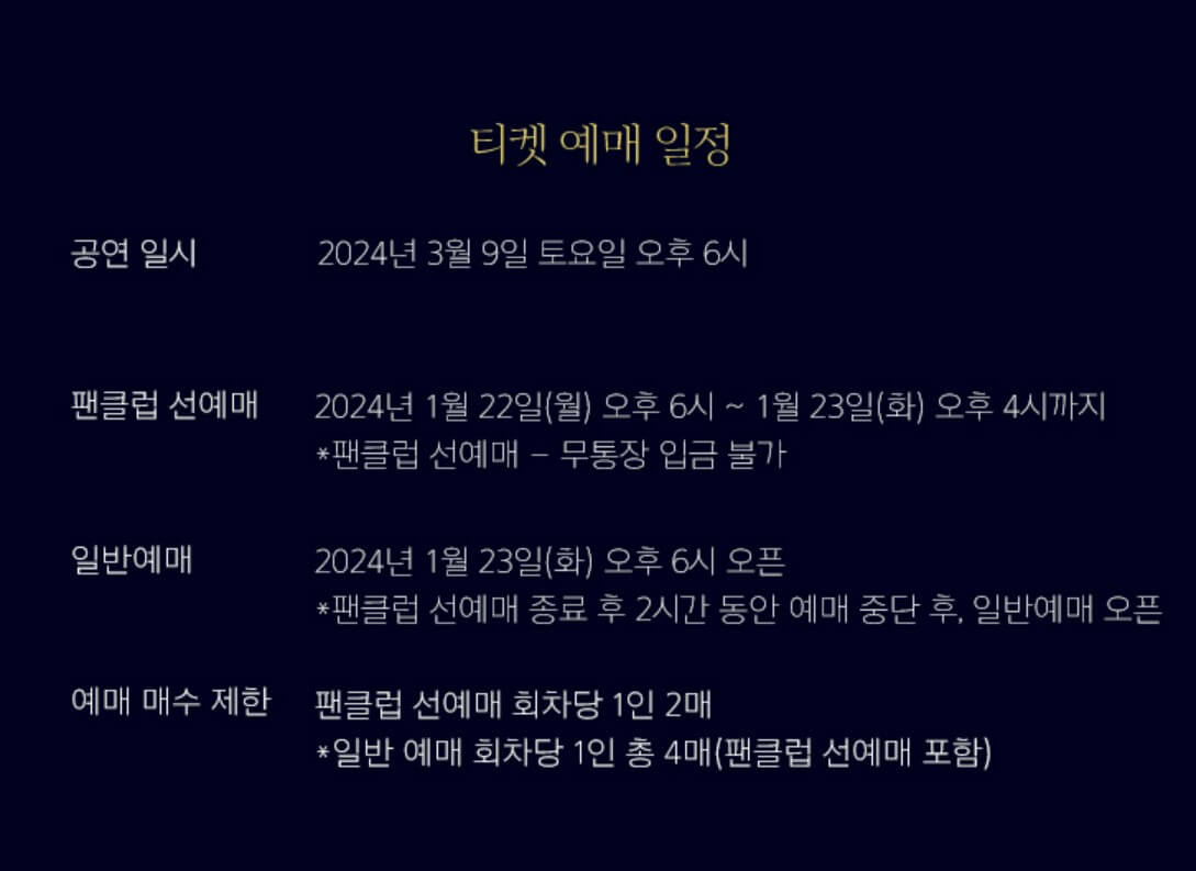 일반 예매 기간은 2024년 1월 30일 화요일 오후 6시부터 남은 좌석에 대해 예매가 가능합니다. 일반 예매는 회당 1인 4매까지 예매가 가능하며 팬클럽 선예매 후 잔여석에 대해 진행됩니다. 무통장 입금도 가능하니 꼭 확인해 보세요.