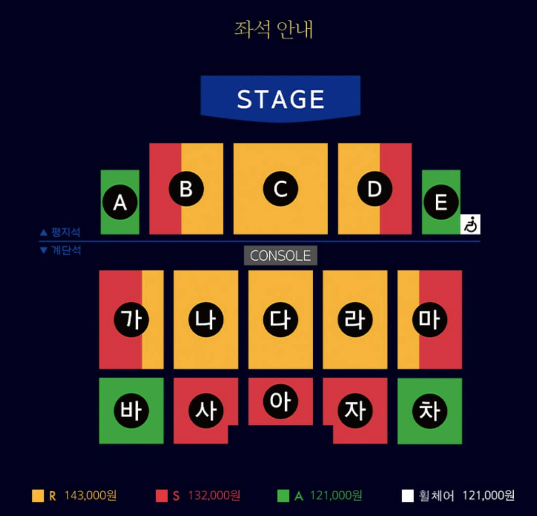 - 공연 구매 가격 R석 : 143,000원 / S석 : 132,000원 / A석 121,000원